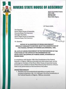Rivers State House of Assembly begins proceedings to impeach Governor Sim Fubara and his deputy.