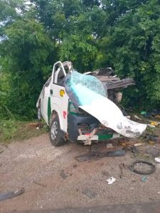 “Preliminary investigation revealed that the crash which occurred as a result of excessive speed and wrongful overtaking involved 2 vehicles; a blue Iveco trailer with no trace of registration and a white Toyota Hiace bus with registration number LSD363YE.