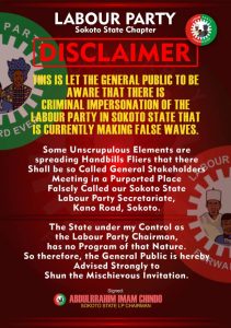 Hon Abdurahim Imam Chindo, the State Labour Party Chairman, released this disclaimer notice to Trustbase news reporter in Abuja on Sunday where he also informed the public that the Sokoto Chapter of the Labour Party under his leadership has no plans of such an unlawful and criminal gathering.