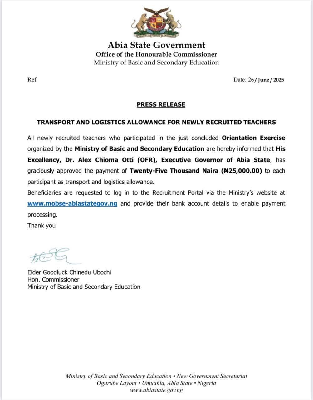 Twenty five thousand naira transport allowance has been approved by the Abia state governor, Dr Alex Otti for each of the over 5,000 newly recruited teachers in the state.