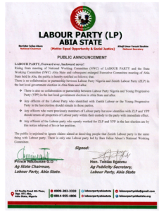 The State Working Committee of the Labour Party in Abia State has refuted claims making rounds by desperate politicians that the Party is in collaboration and or partnership with the ZLP and the YPP in the recently conducted LG elections in Abia State.