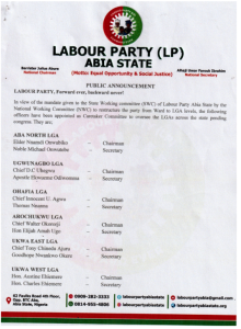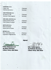 Abia Labour Party Refutes Claims Of Collaboration With ZLP, YPP, As Party Appoints New LGA Caretaker Committees.