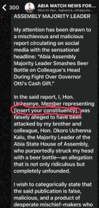“I, Hon. Ucheonye, Member representing [insert your constituency], was falsely alleged to have been attacked by my brother and colleague, Hon. Okoro Uchenna Kalu, the Majority Leader of the Abia State House of Assembly, who purportedly struck my head with a beer bottle-an allegation that is not only ridiculous but completely unfounded,” the statement said.