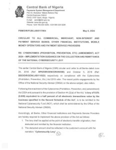 The circular read in part, “Following the enactment of the Cybercrime (Prohibition, Prevention, etc) (amendment) Act 2024 and pursuant to the provision of Section 44 (2)(a) of the Act, ‘a levy of 0.5% (0.005) equivalent to a half percent of all electronic transactions value by the business specified in the Second Schedule of the Act,’ is to be remitted to the National Cybersecurity Fund, which shall be administered by the Office of the National Security Adviser.”
