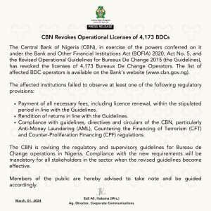 ECONOMY CBN revokes operational licenses of 4,173 BDCs By Trustbase News On Mar 2, 2024 0 Share CBN revokes operational licenses of 4,173 BDCs. See lists below: https://drive.google.com/file/d/11SlXJ19wYEEs4wVndtUDRUx6uwhmNLrO/view?usp=drivesdk ADVERT BDCCBN 0 Share FacebookTwitterGoogle+ReddItWhatsAppPinterestEmail