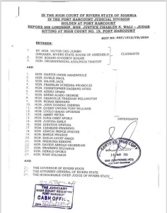 A Rivers State High Court sitting in Port Harcourt has granted an order of interlocutory injunction restraining Martin Amaewhule and 24 other lawmakers from parading and holding themselves as members of the Rivers State House of Assembly.