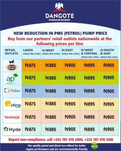 The Dangote Petroleum Refinery has announced a fresh cut in the pump prices of Premium Motor Spirit (petrol) nationwide.