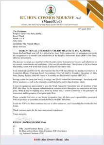 “I hope this letter finds you well. It is with a heavy heart that I compose this correspondence to tender my resignation as a member and stakeholder in the People’s Democratic Party (PDP) Abia State, effective immediately.
