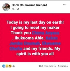 Richard had dropped a cryptic post on his Facebook handle on Tuesday which read “today is my last day on earth. I am going to meet my maker……”
