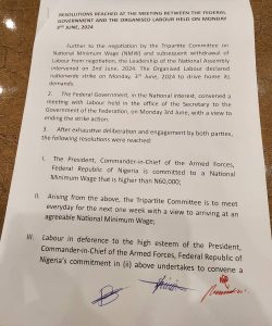 The agreement stated, “The President of Nigeria, Commander-in-Chief of the Armed Forces, is committed to establishing a National Minimum Wage higher than N60,000; and the Tripartite Committee will convene daily for the next week to finalise an agreeable National Minimum Wage.”