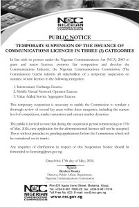 The commission made the announcement in a post on its X handle on Friday with the caption: “Temporary Suspension Of The Issuance Of Communications Licences In Three Categories” and was signed by the Director, Public Affairs Department, NCC, Reuben Muoka.