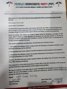 “The suspension is in line with provisions of Article 59 (1) of the PDP constitution which empowers the Ward party excos to take disciplinary actions against erring members.”
