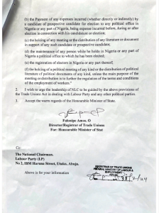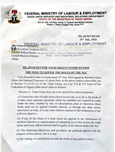 “Director/Registrar of Trade Unions, Falonipe Amos refers the NLC to Section 15 (1) (2) (3) of the Trade Unions Act ‘Cap T14 & TI5 Laws of the Federation of Nigeria 2004 wherein on no account should NLC be involved in the running or patronizing political parties or persons into elective office.