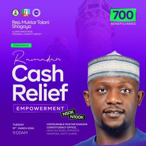 The Representative of Ilorin west/ASA Federal Constituency, Hon Muktar Tolani Shagaya has promised to empower his Constituents as a Ramadan Cash Relief as beneficiaries will be rewarded with cash gifts of N50,000 and N100,000 respectively among other benefits which will be to cushion the effects of the hardship in this Ramadan seasons.