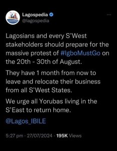 The attention of Lagos State Governor, Mr. Babajide Sanwo-Olu has been drawn to a post by LagosPedia, a social media handle on X (formerly Twitter) that calls on the Igbo to vacate Lagos and Southwest of Nigeria and brace up for a massive hashtag