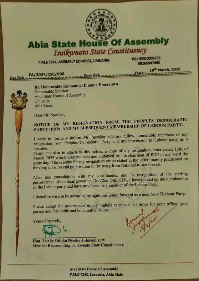 A resignation letter addressed to the speaker of the Assembly, Rt. Hon. Emmanuel Ihuoma Emeruwa, dated March 18th, 2025 and sighted by Trustbase News on Tuesday, March 25, revealed that Johnson has moved to the ruling Labour Party.