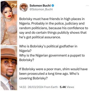 Buchi amid the controversy trailing Bobrisky after he won the best female dressed in a movie premiere, noted that if Bobrisky were to be a poor man without political backup, he would have been prosecuted adding that ” his confidence to say and do certain things publicly shows that he’s got political assurance.